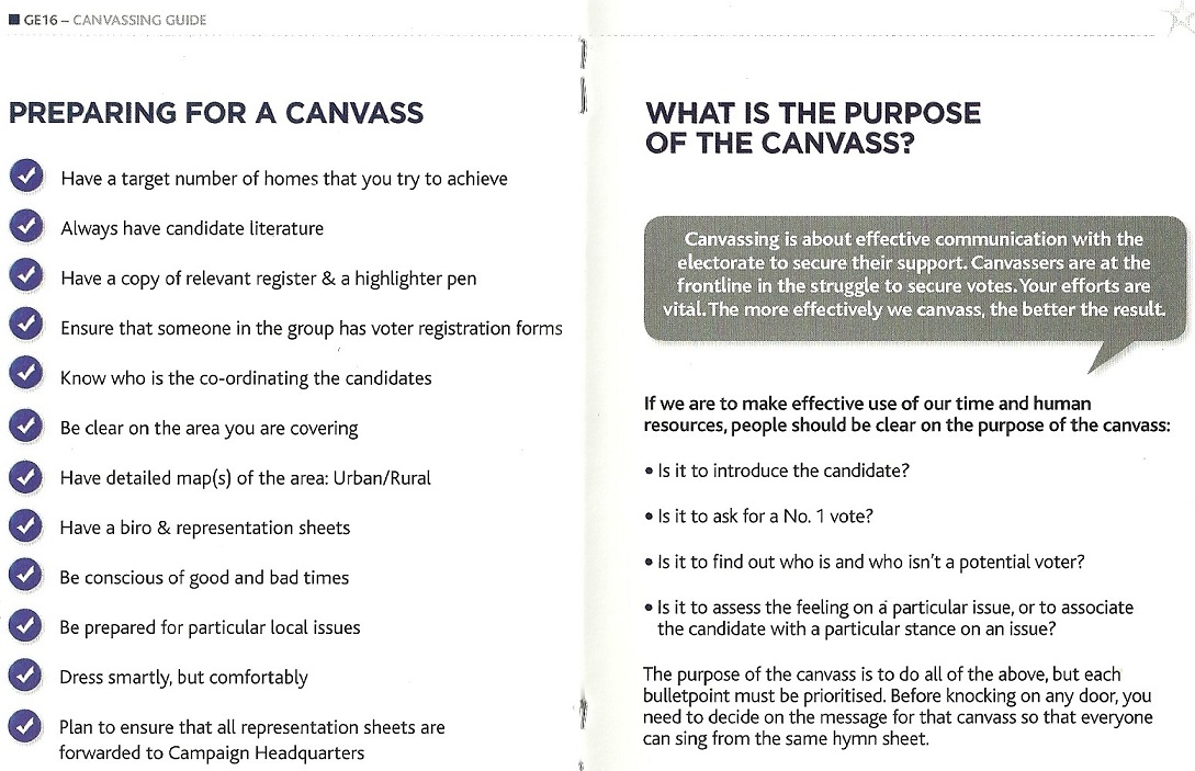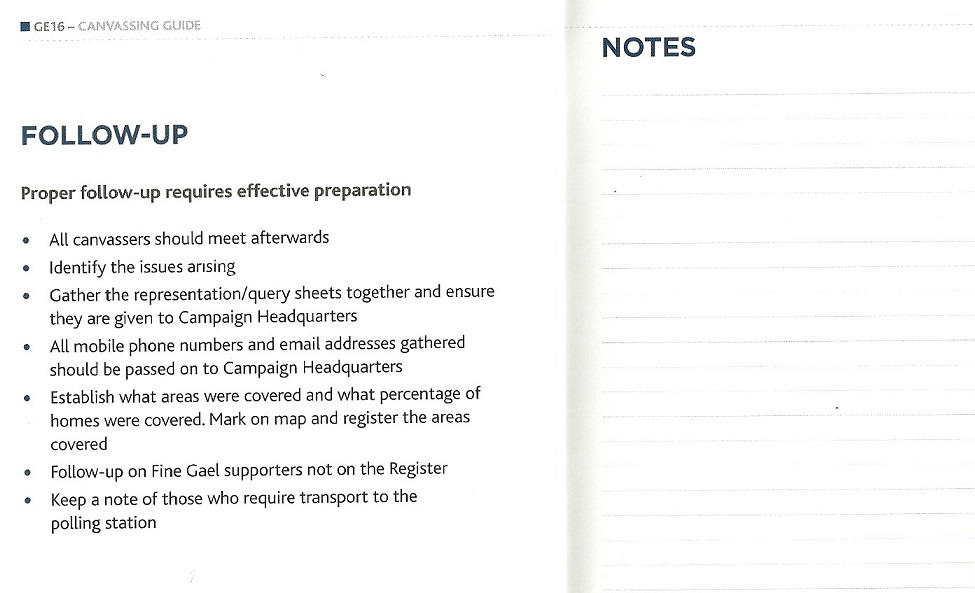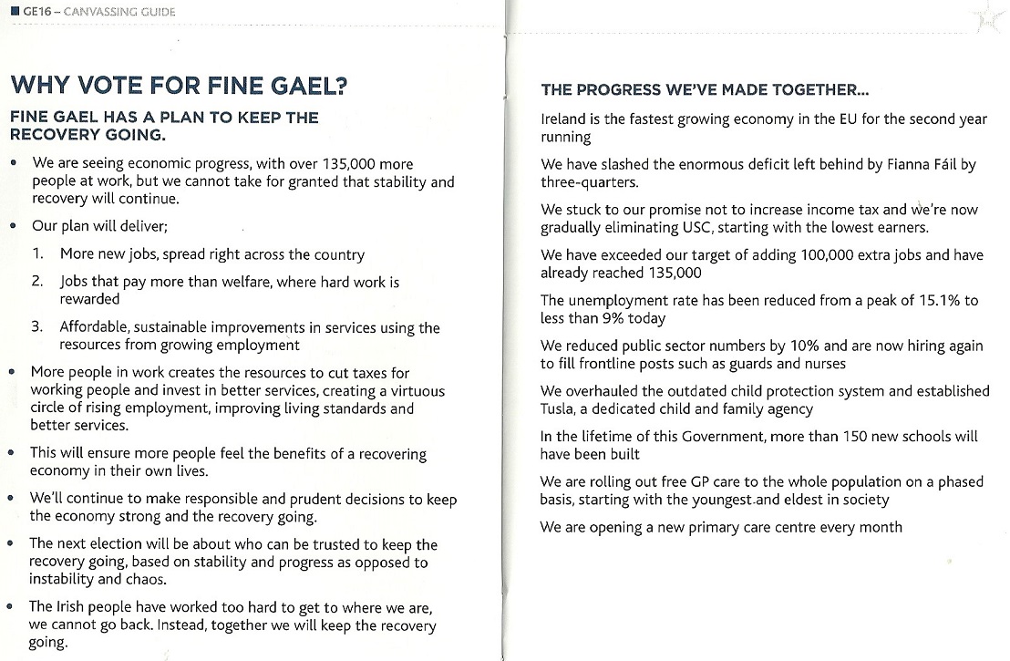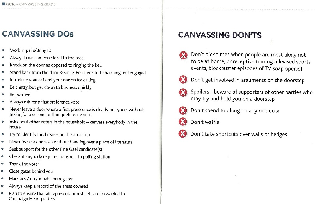 A guide to canvassing produced by Fine Gael for the 2016 General Election. Contains canvassing tips, ‘Why Vote Fine Gael?’, what to say about other parties and more.