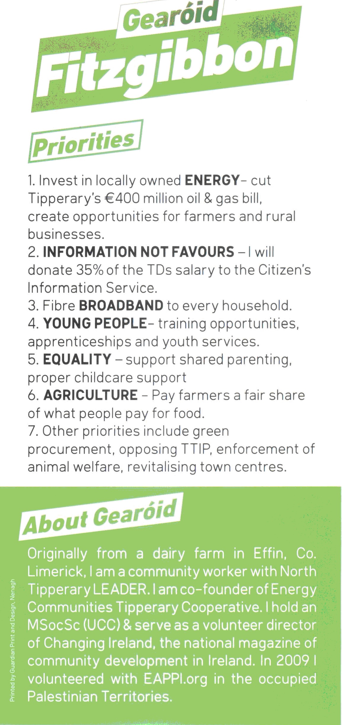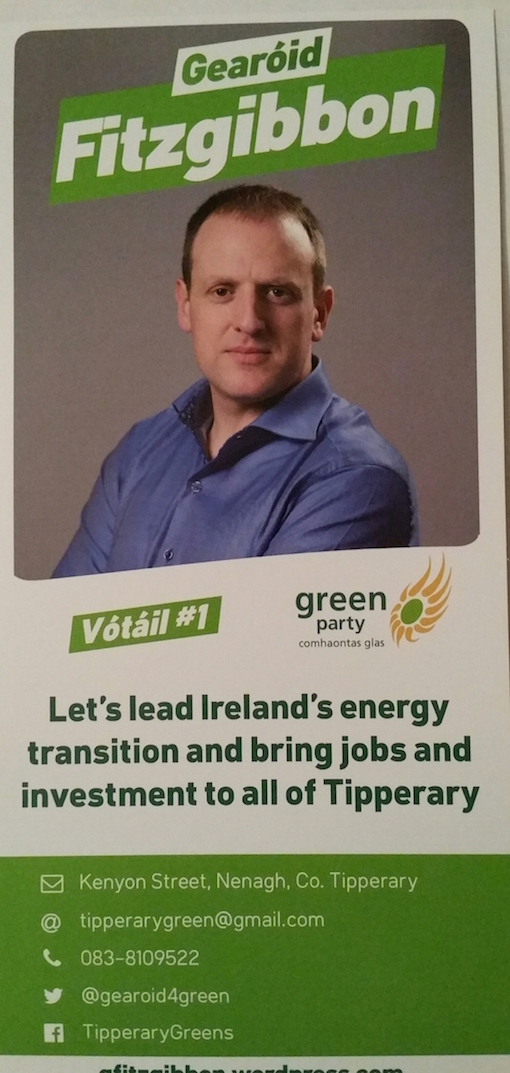 A leaflet from Gearóid Fitzgibbon who is running for The Green Party in Tipperary.