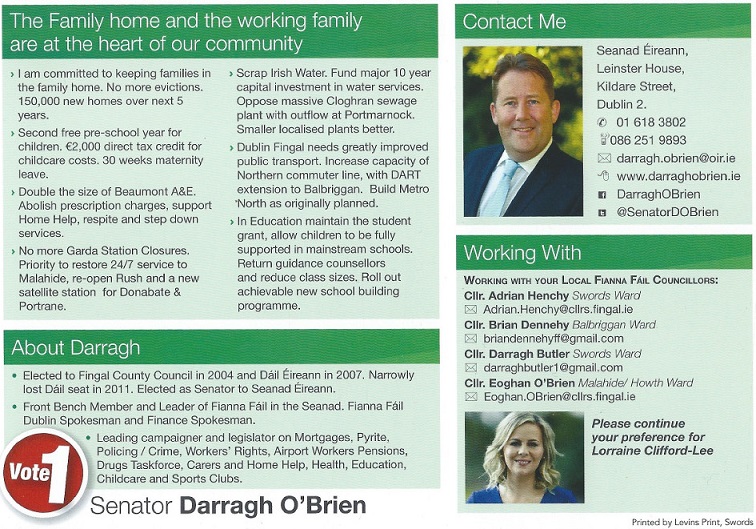 A leaflet from Darragh O’Brien who is running for Fianna Fail in Dublin Fingal,