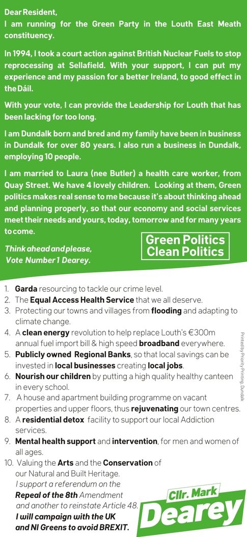 A leaflet from Mark Dearey who is running for the Green Party in Louth
