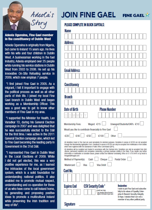 “Supporting The New Irish” a leaflet from Fine Gael giving details of what Fine Gael have done for ‘The New Irish’ since the party has been in Government. It also has a membership form.