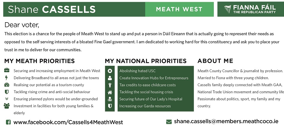 A canvass card from Shane Cassells who is running for Fianna Fail in Meath West.