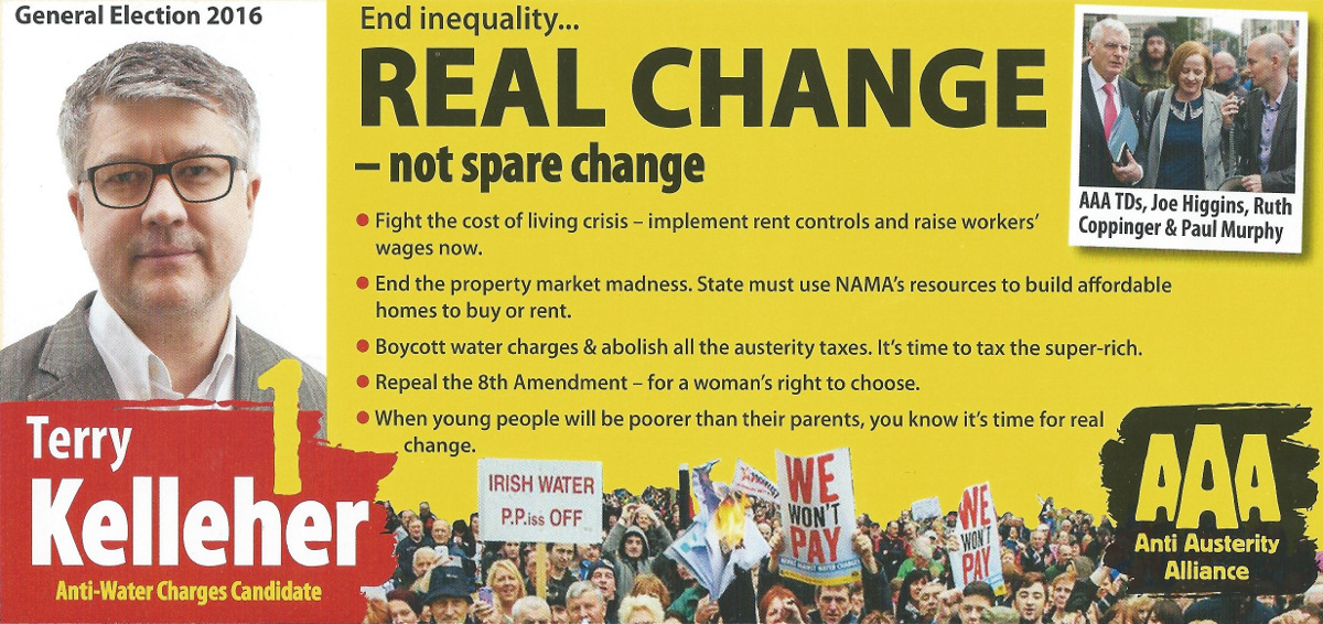 A leaflet from Terry Kelleher who is running for The Anti Austerity Alliance People Before Profit in Dublin Fingal.