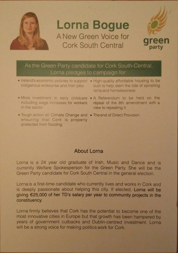 A leaflet from Lorna Bogue who is running for the Green Party in Cork South Central.