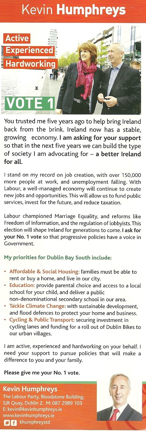 A leaflet from Kevin Humphreys who is running for Labour in Dublin Bay South.