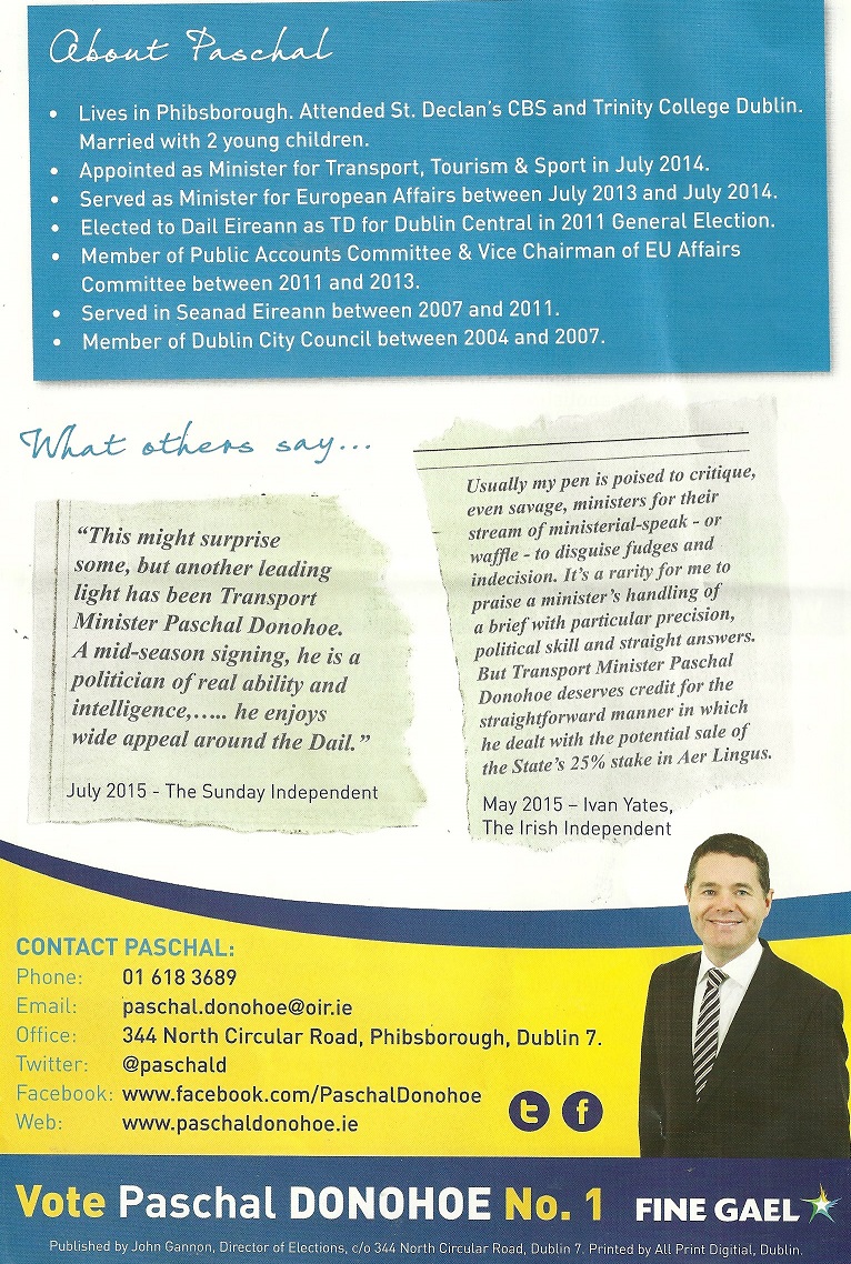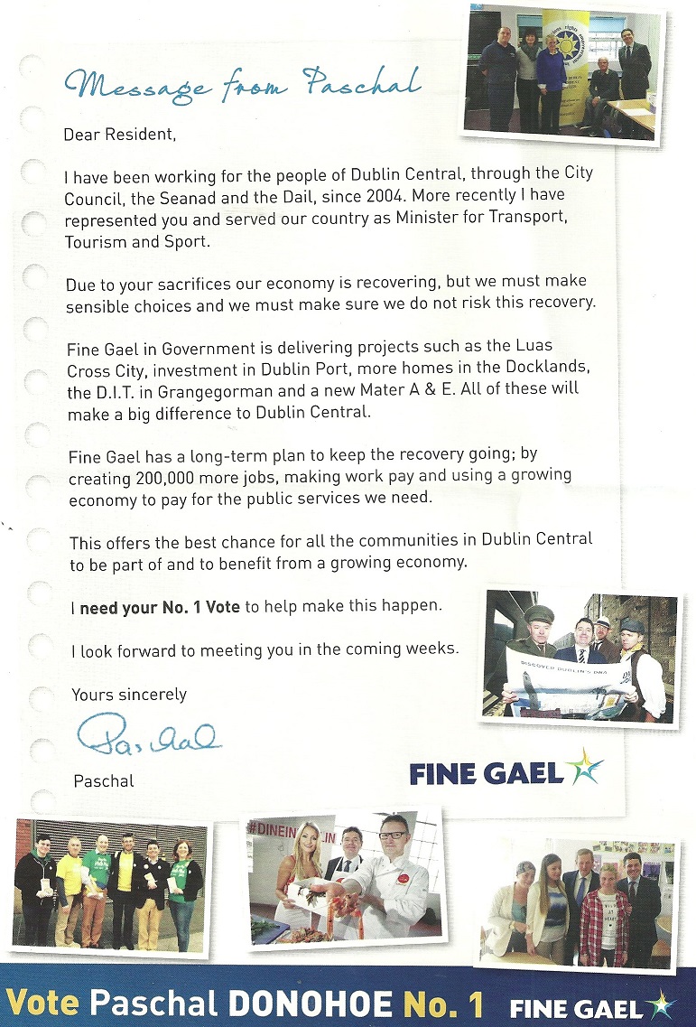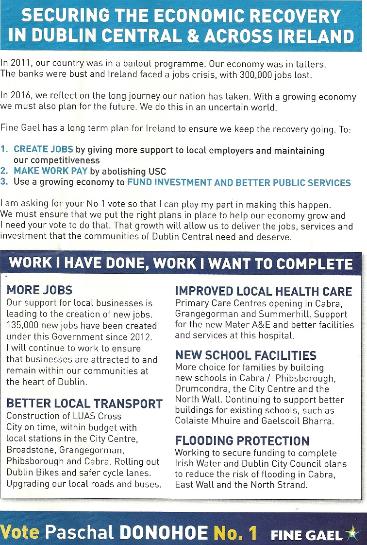 A leaflet from Paschal Donohoe who is running for Fine Gael in Dublin Central.