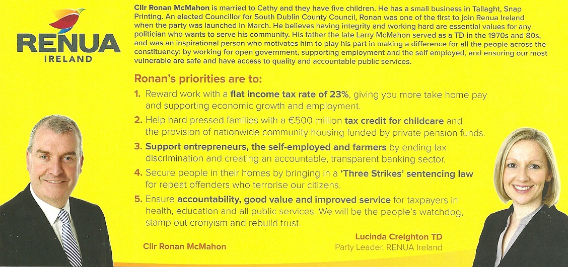 A leaflet from Councillor Ronan McMahon who is running for Renua Ireland in Dublin South West