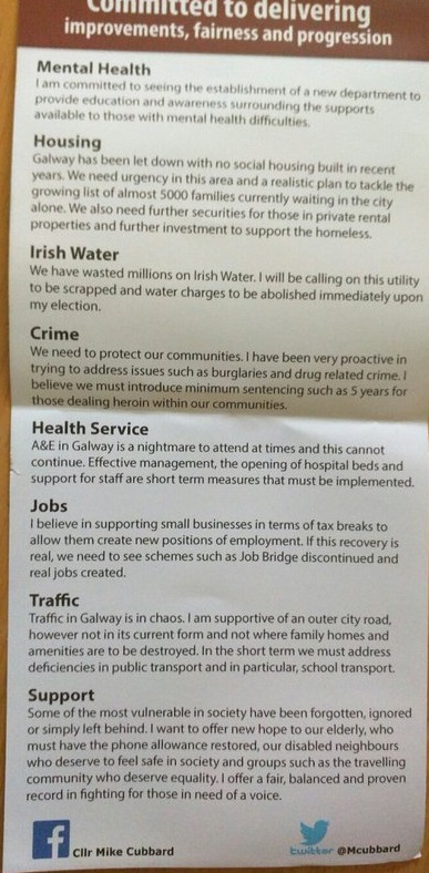 A leaflet from Independent Councillor Mike Cubbard who is running in Galway West.