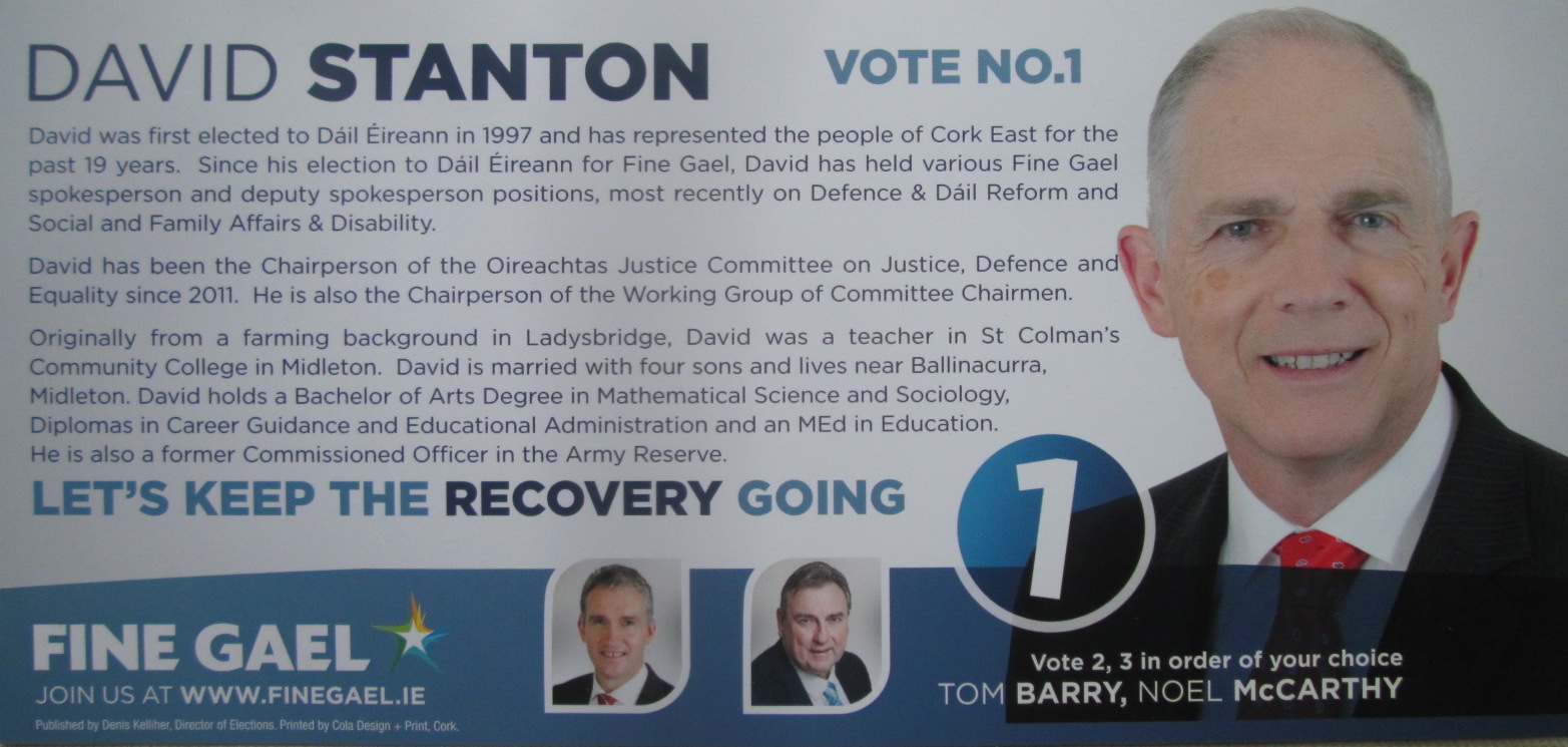 A flyer from David Stanton who is running for Fine Gael in Cork East.