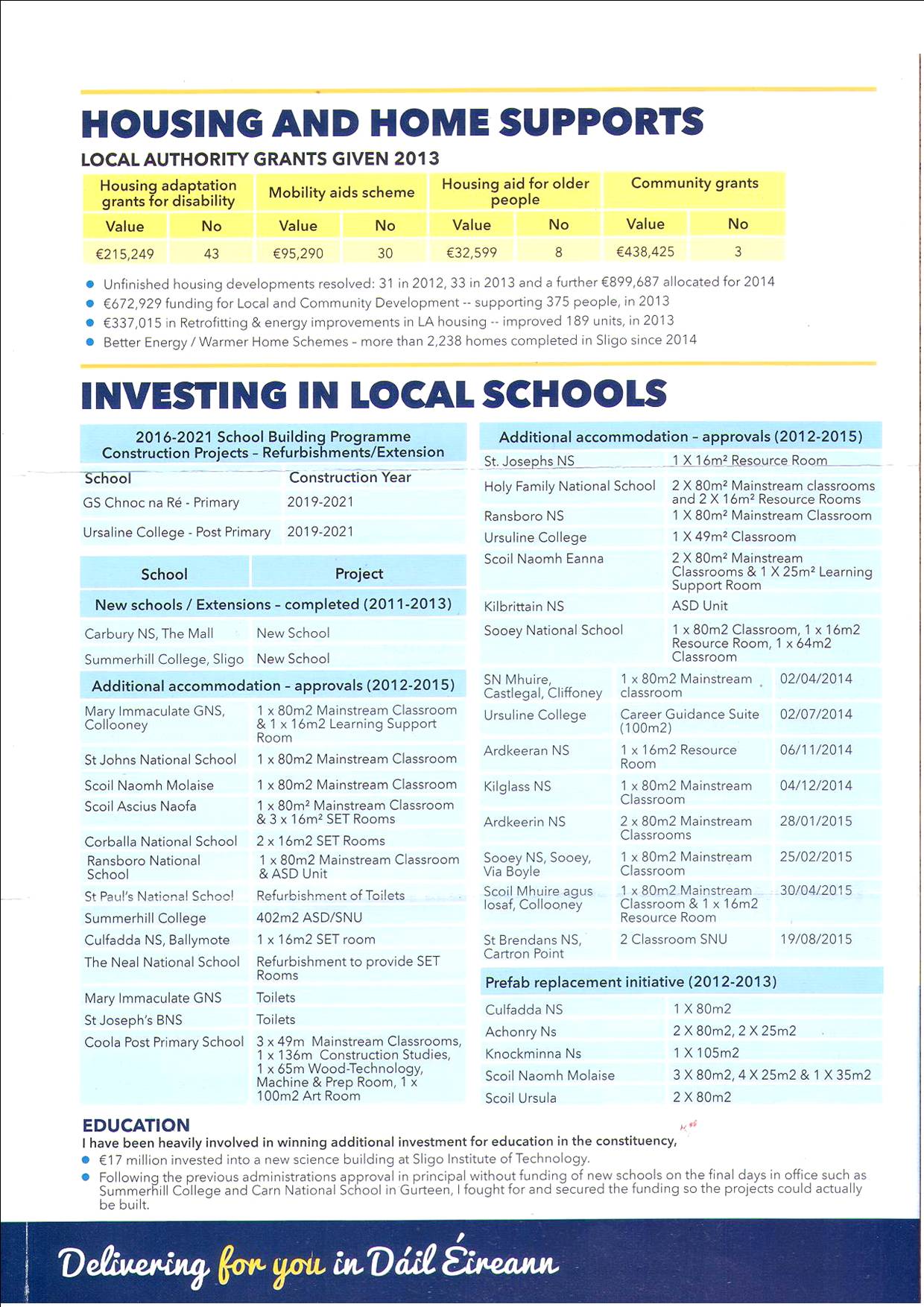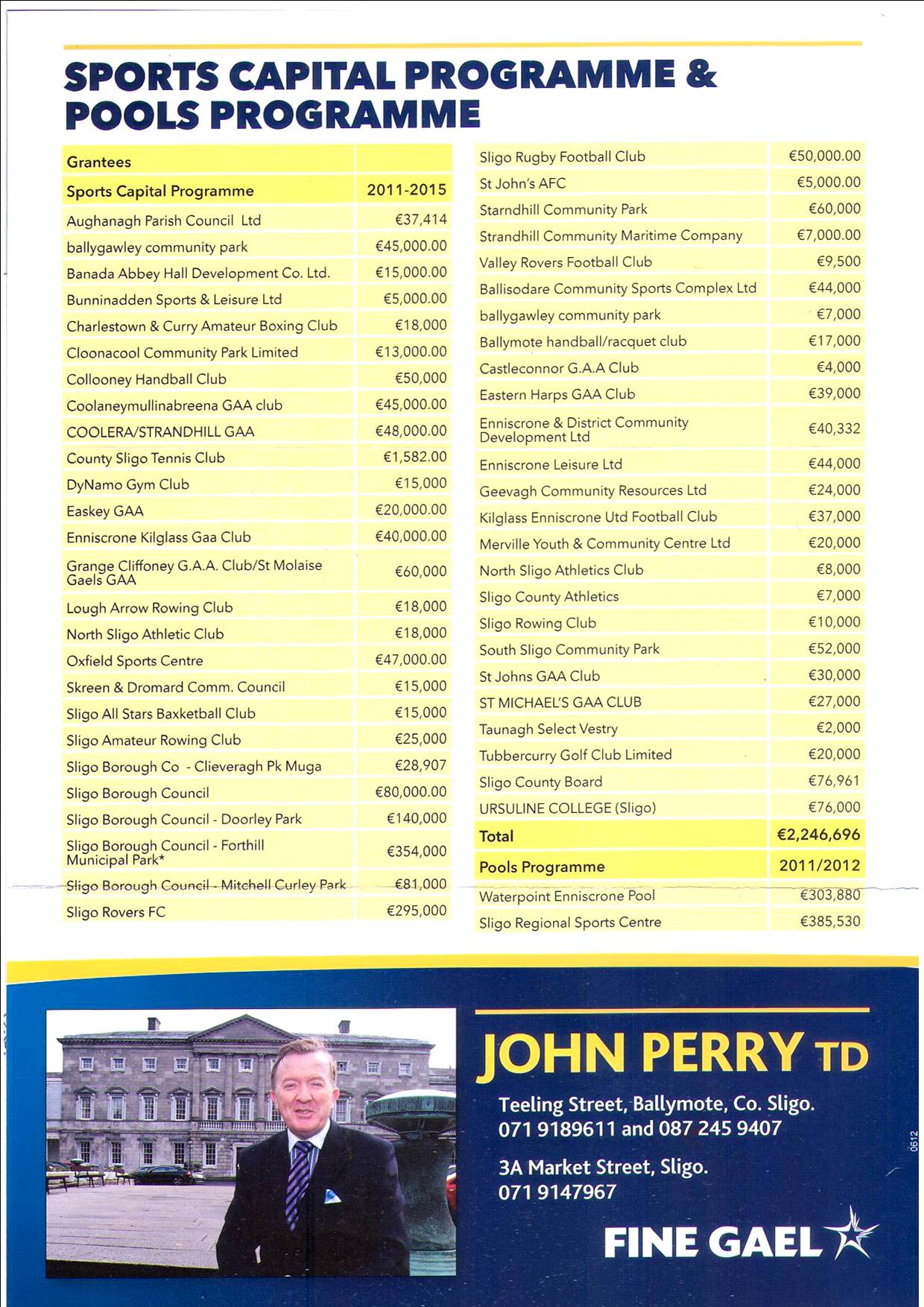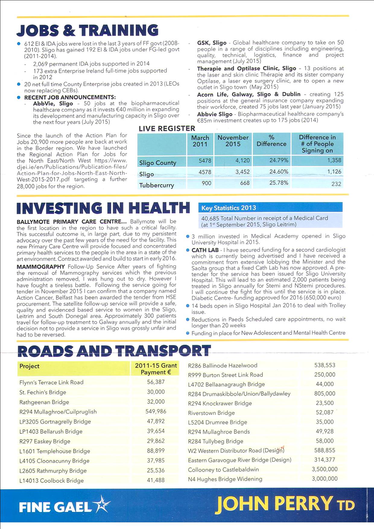 A leaflet from John Perry of Fine Gael giving details of what has been delivered to Sligo/Leitrim during the term of the government.