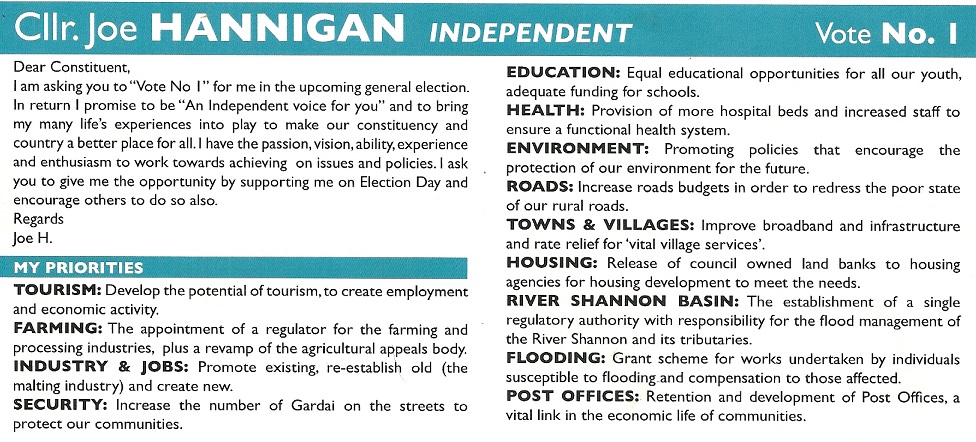 A leaflet from Tipperary based Joe Hannigan who is running as an Independent in the Offaly North Tipperary Constituency .