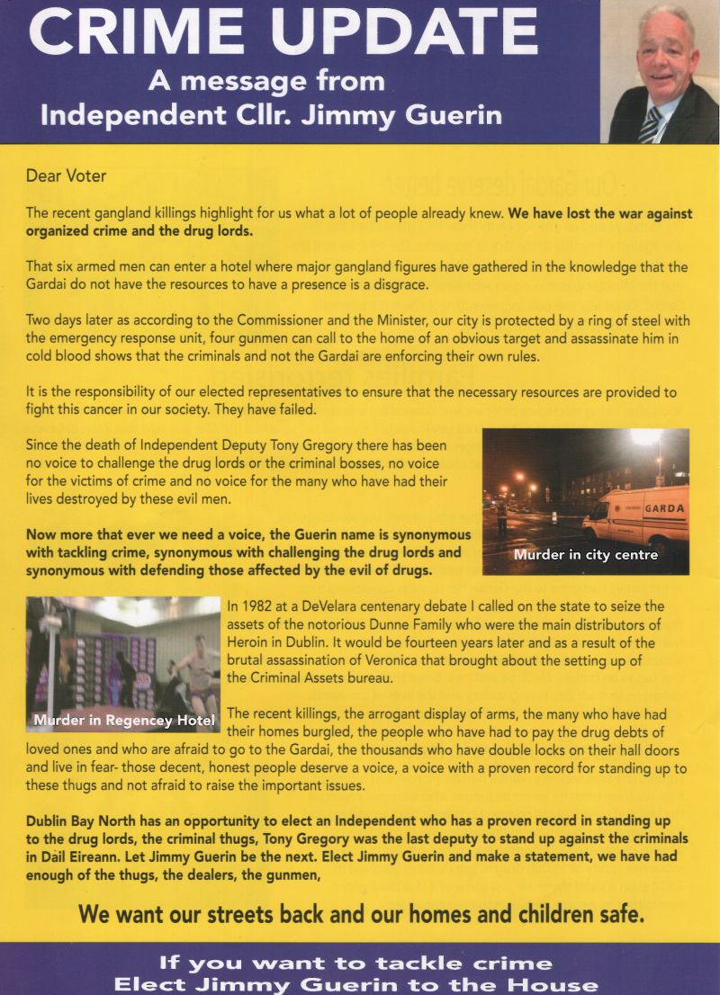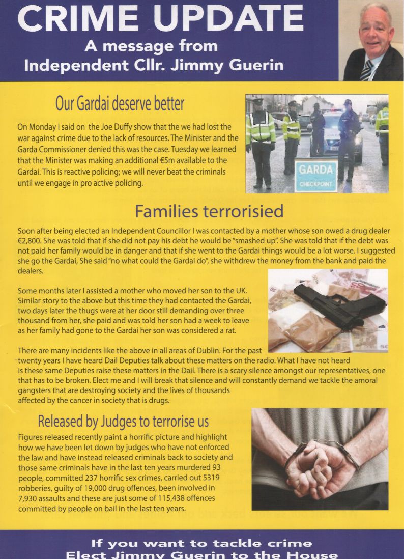 A “Crime Update” Leaflet from Jimmy Guerin who is running as an Independent in Dublin Bay North.