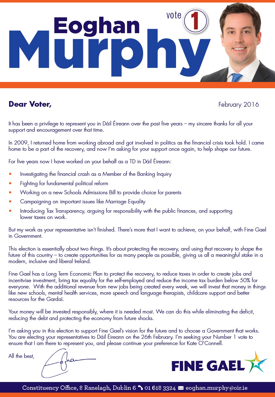 A letter to voters from Eoghan Murphy who is running for Fine Gael in Dublin Bay South.