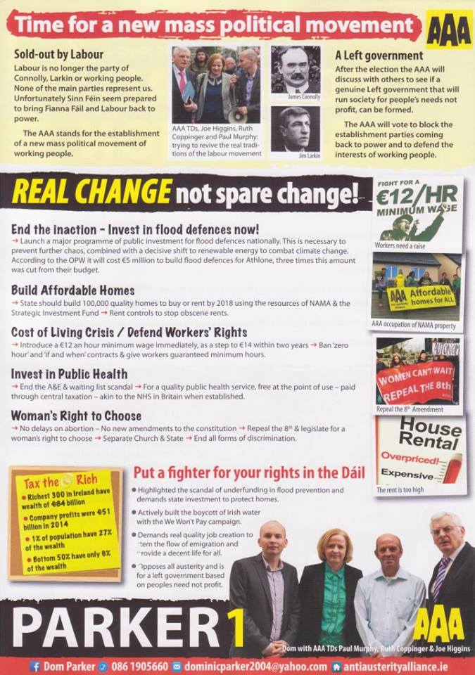 A leaflet from Dom Parker who is running for The Anti Austerity Alliance in Longford Westmeath.