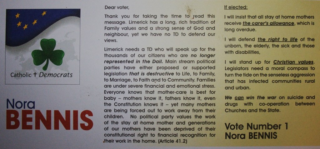 Leaflet from Nora Bennis -Catholic Democrats -Limerick City #ge16 » Nora 002