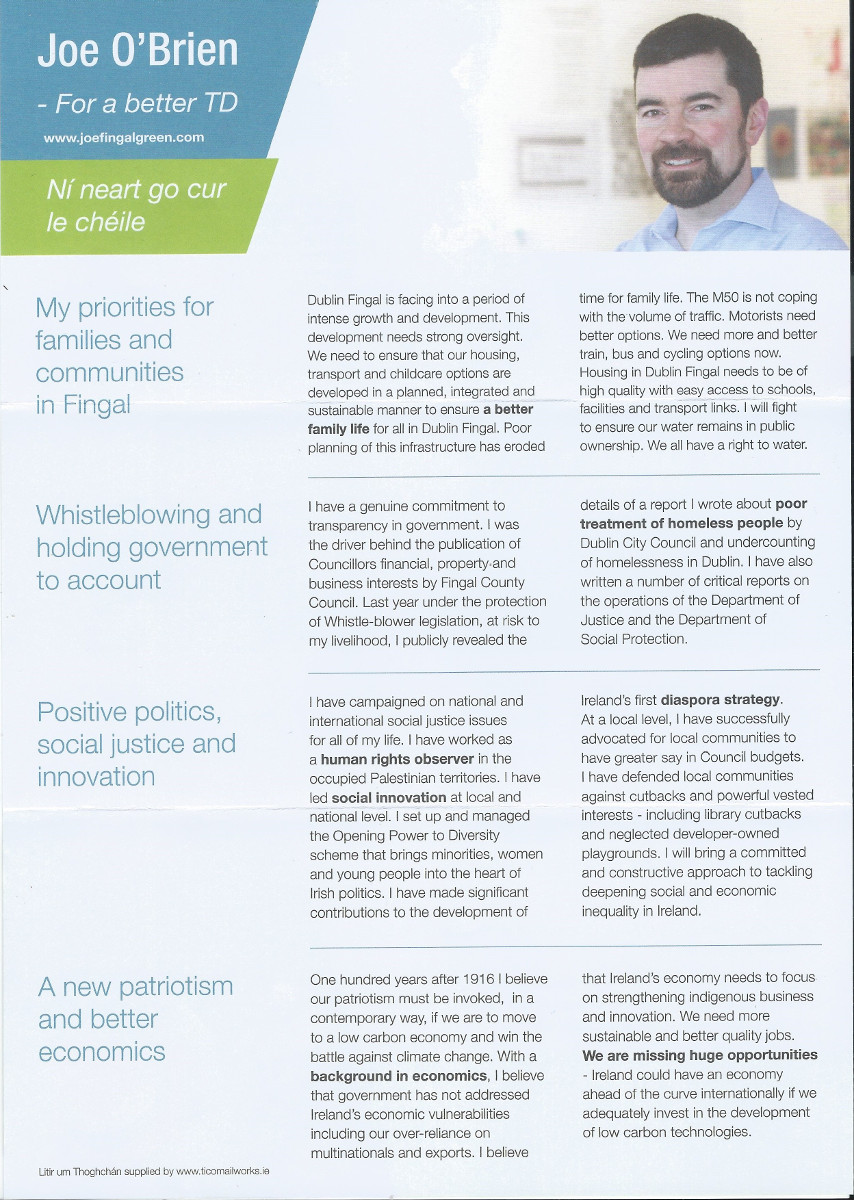 A Litir um Thoghchán from Joe O’Brien who is running for The Green Party in Dublin Fingal.