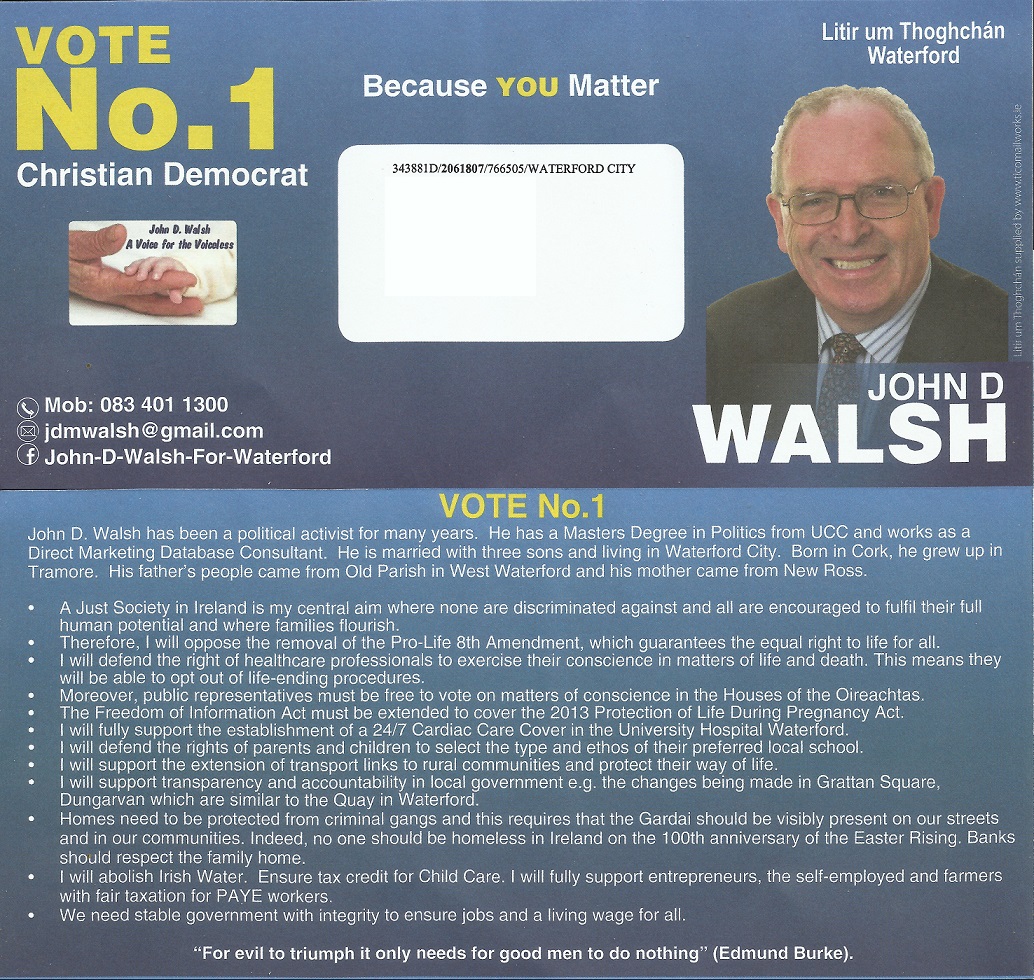 A Leaflet From John D Walsh who is running as a Christian Democrat in Waterford.