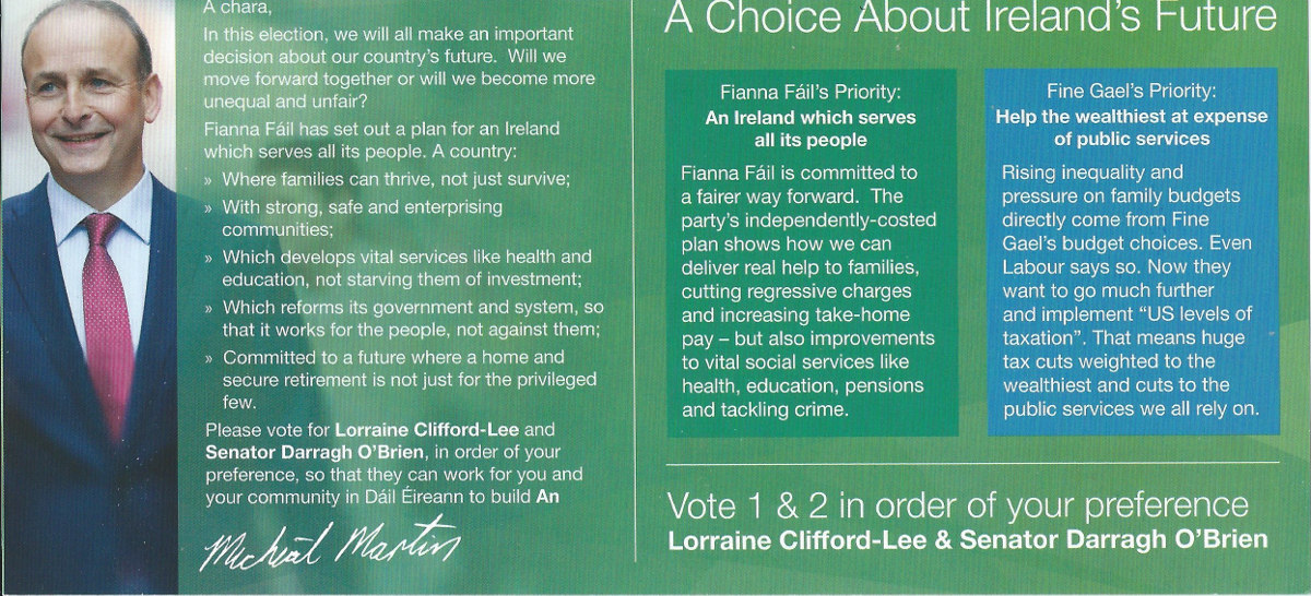 A Litir um Thoghchán from Lorraine Clifford Lee and Darragh O’Brien who are running for Fianna Fail in Dublin Fingal.