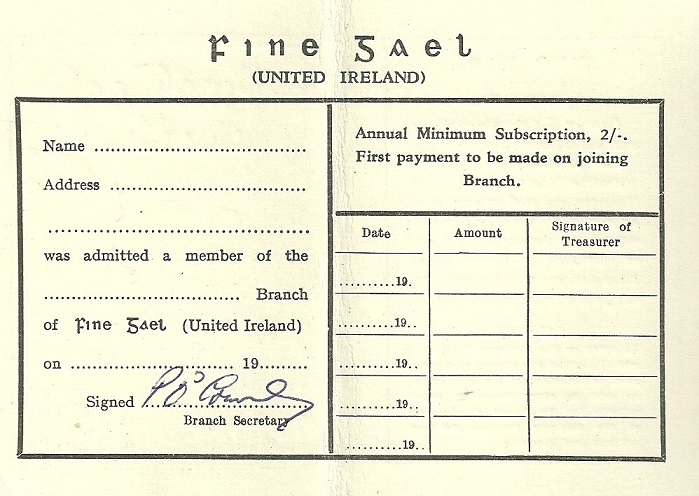 A Fine Gael Membership card from I think around 1950. Interesting to see the old Fine Gael logo on it.