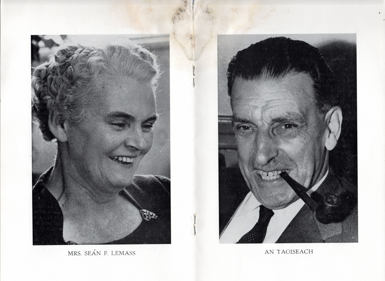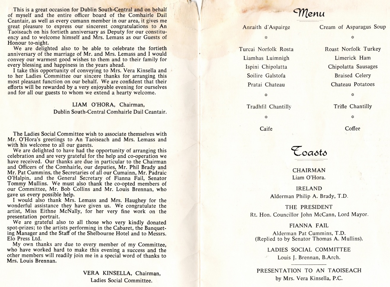 A lovely Souveneir programme for a dinner dance and presentation to then Taoiseach Séan Lemass to mark his 40th anniversary as a TD and also to mark the 40th wedding anniversary of Mr and Mrs Lemass. It was held in The Shelbourne Hotel and was organised by his Dublin South Central Constituencey organisation.
