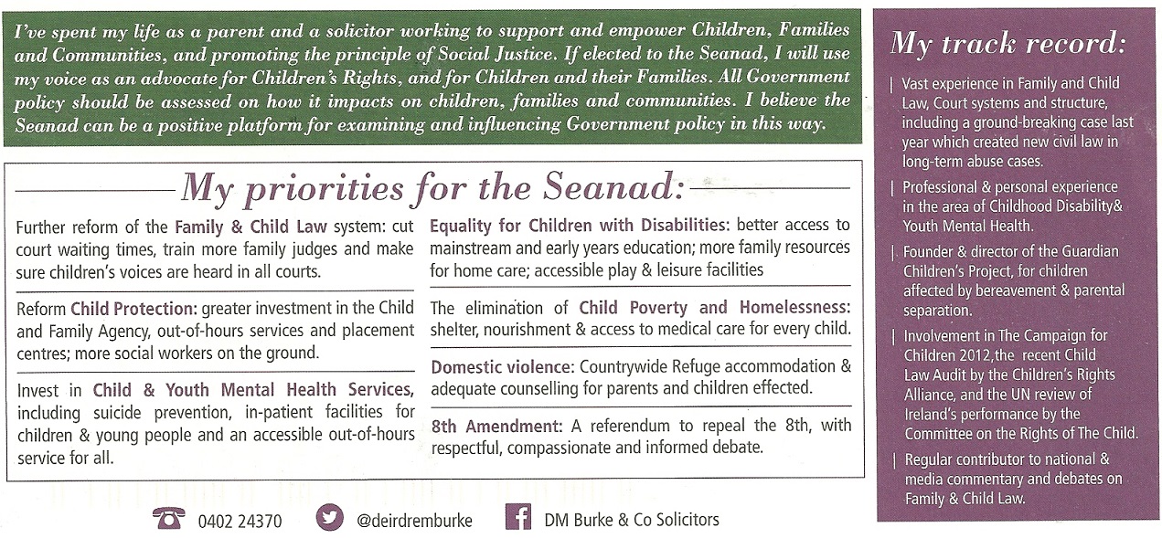 A Leaflet from Deirdre Burke who is running for a seat on the NUI Panel in the Seanad Elections.