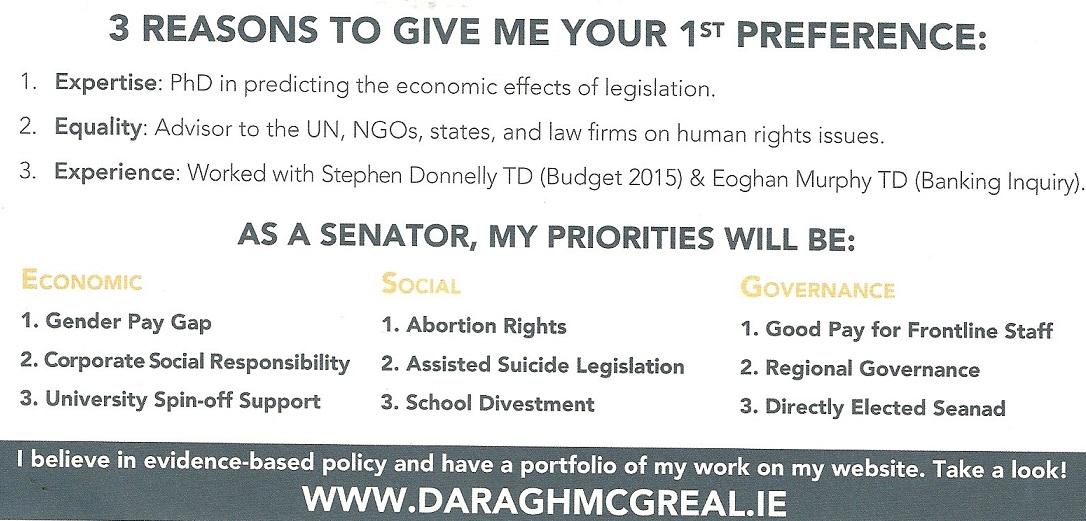 A Leaflet from Daragh McGreal who is running for the Seanad on the NUI panel.