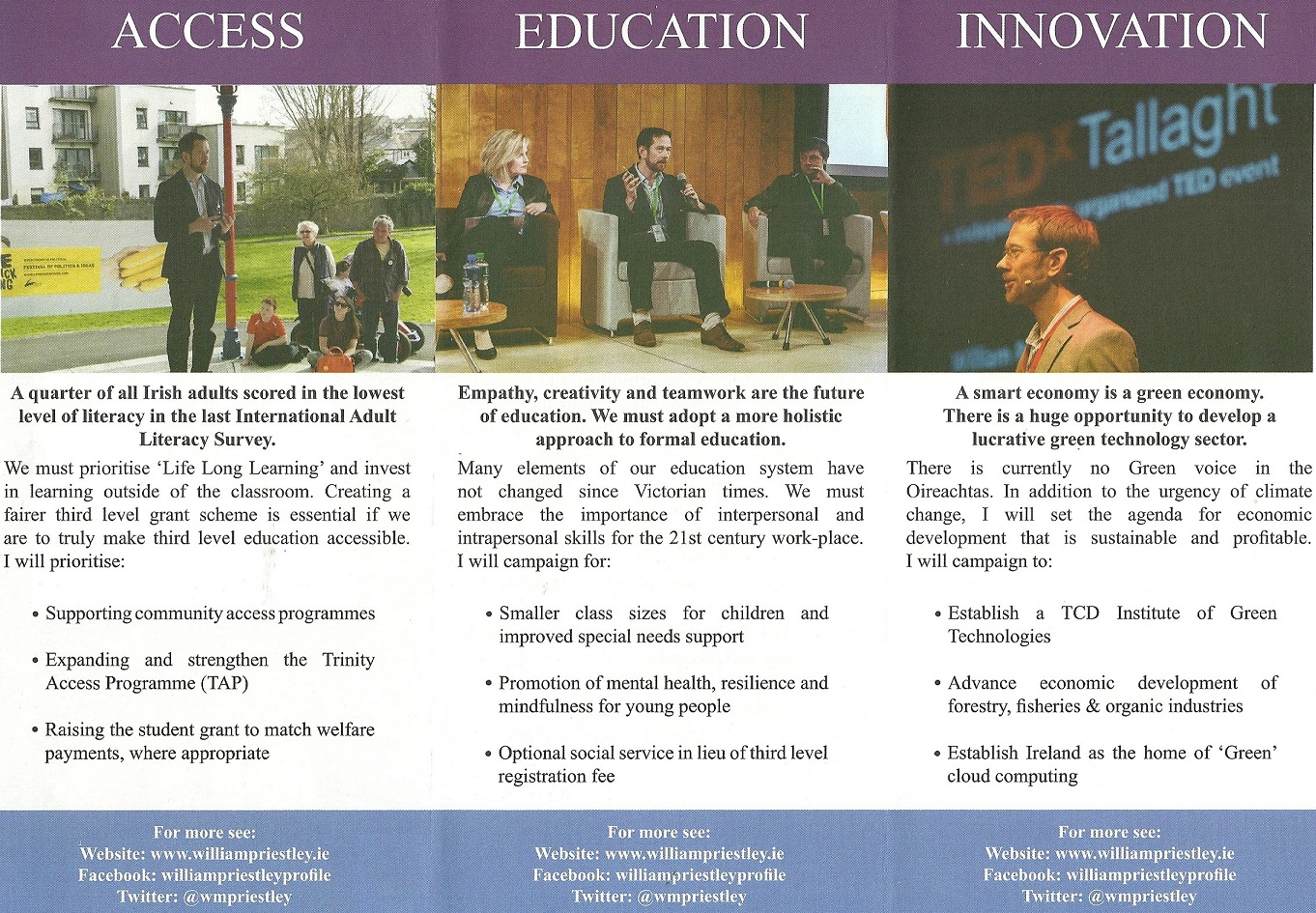 A Leaflet from William Priestley who is running for the Seanad on the TRinity Panel.