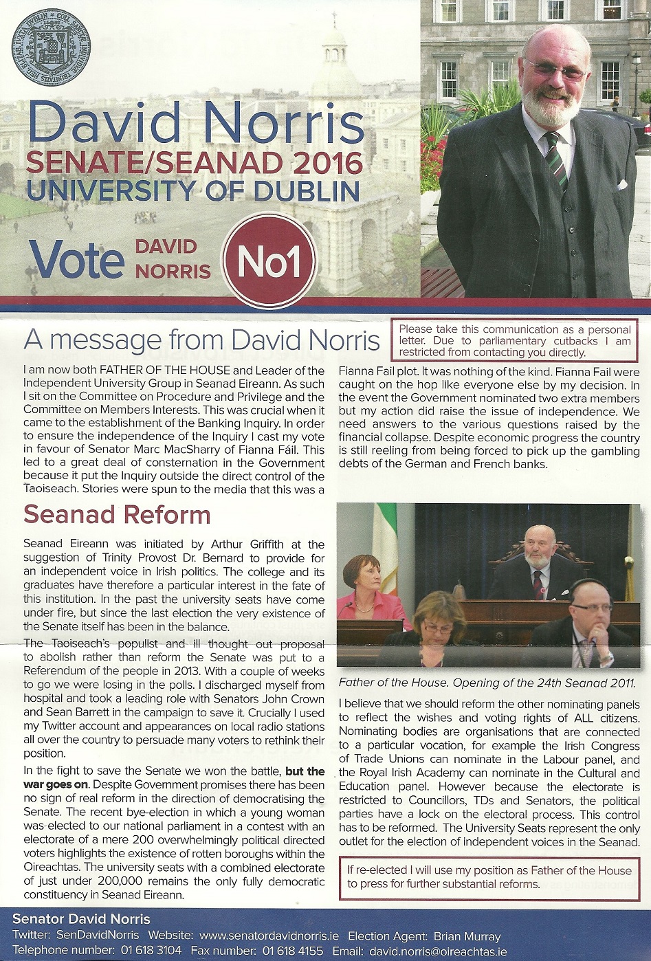 Leaflet from David Norris – Trinity Seanad #Seanad16 #TCDSeanad » DNorris1