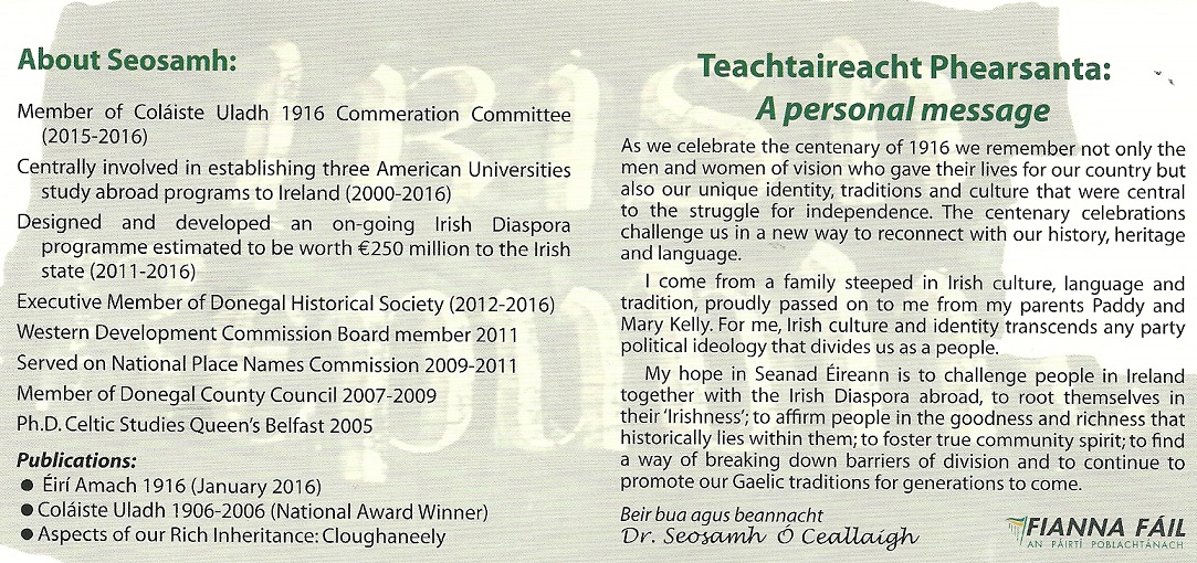 A leaflet from Dr. Seosamh Ó Ceallaigh of Fianna Fail who is running for The Seanad on the Cultural & Educational Panel.