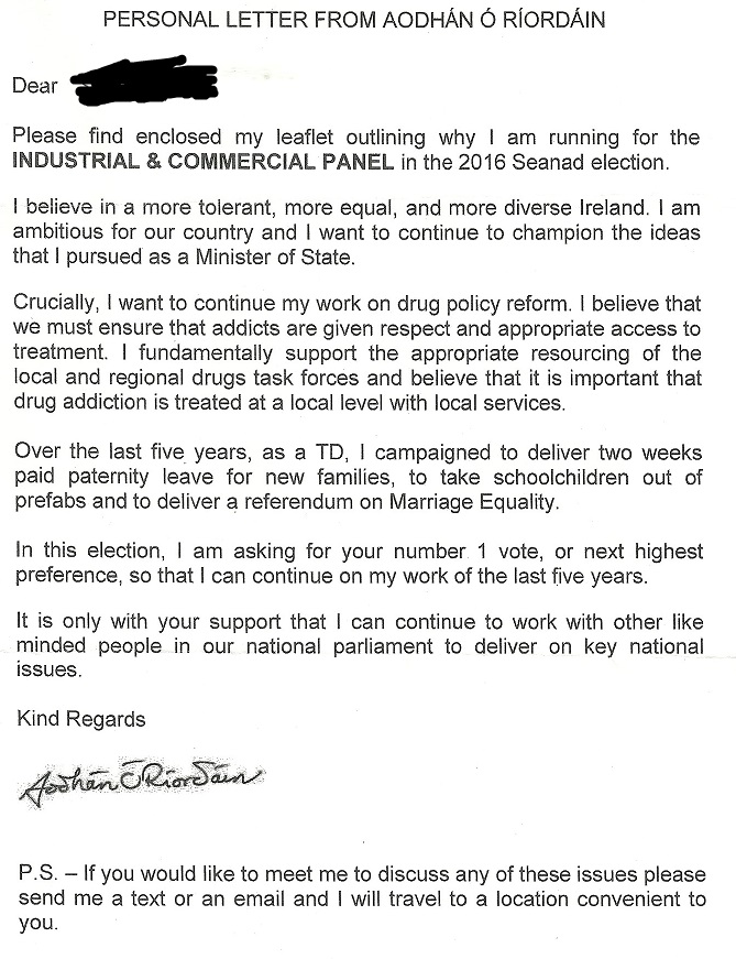 Letter and Leaflet from Aodhán Ó Ríordáin-Labour -Industrial & Commercial Panel #Seanad16 » AORlett