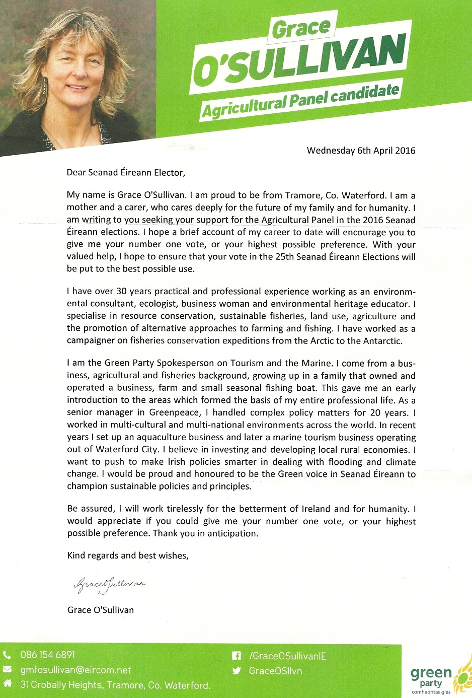 Letter from Grace O’Sullivan – Green Party – Agricultural Panel #Seanad16 #SE16 » GraceOS