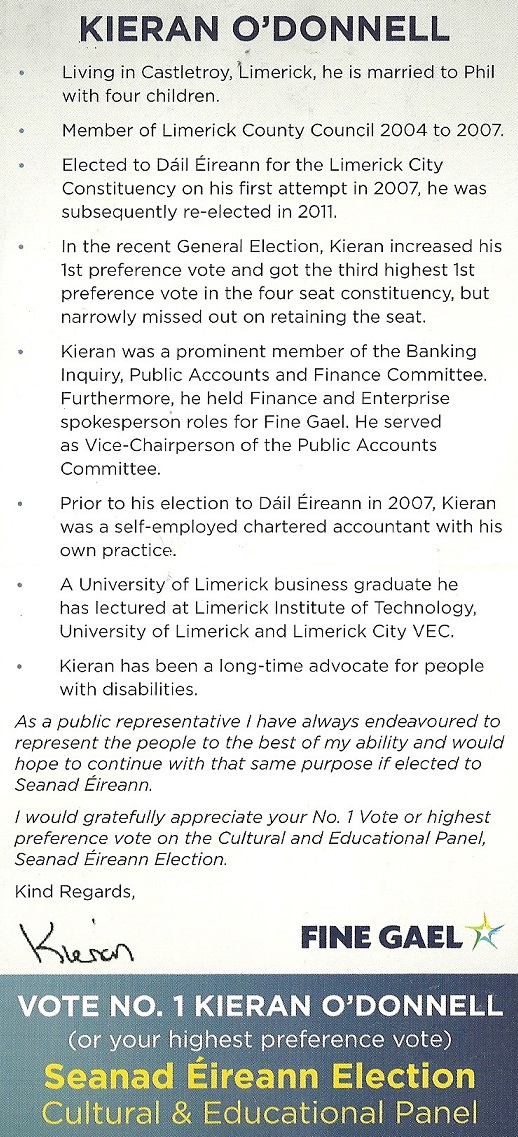 Leaflet from Kieran O’Donnell-Fine Gael- Cultural & Educational Panel #Seanad16 » KODonnell2