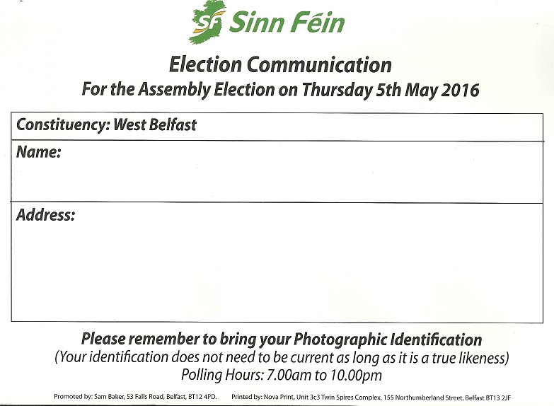 Sinn Fein “5 Point Pledge” Leaflet #AE16 » WBelSF3