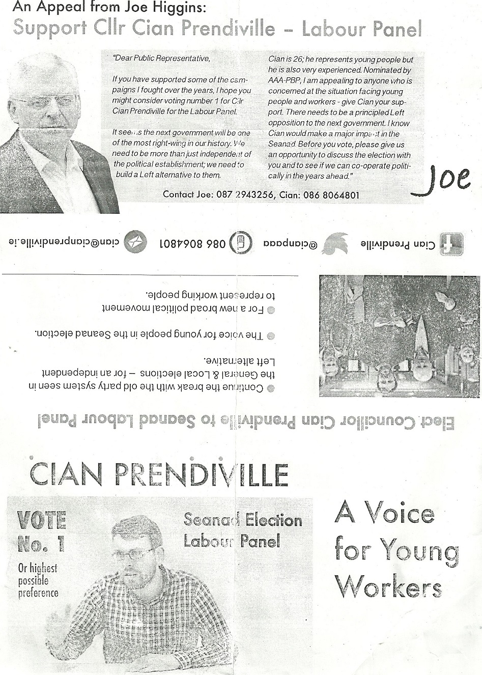 A Leaflet from Cian Prendiville of The AAAPBP who is running for a Seanad seat on The Labour Panel.