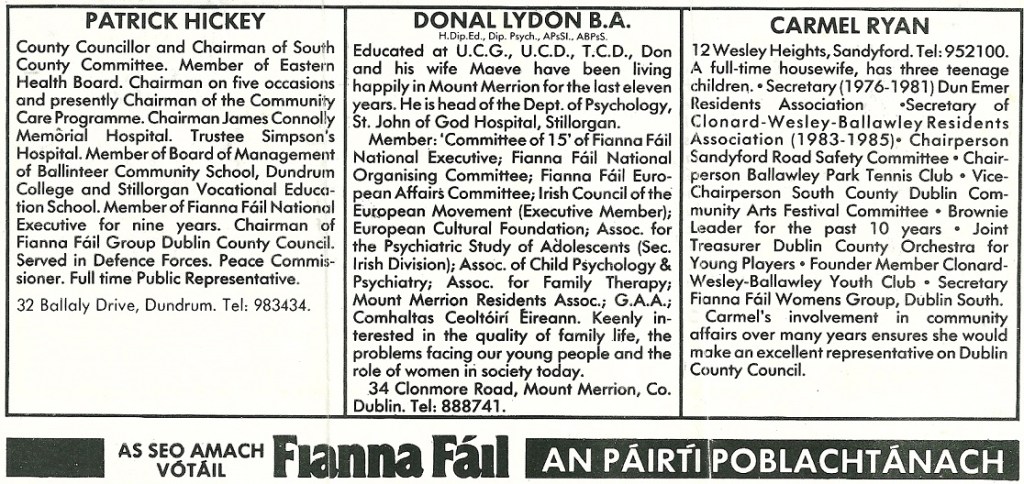 Leaflet from Pat Hickey, Don Lydon, Carmel Ryan -Fianna Fail -Stillorgan -1985 Local Elections » HickeyLydonRyan85b