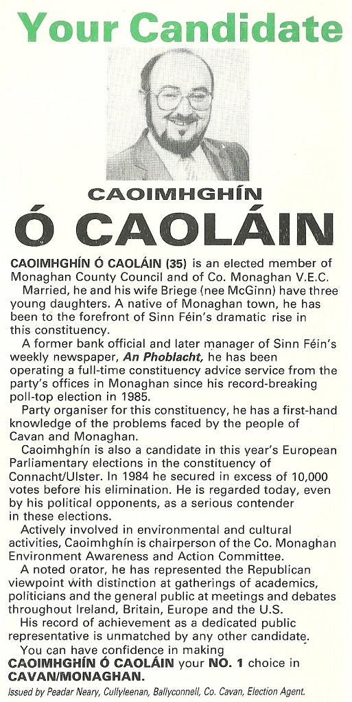 Leaflet from Caoimhghín Ó Caoláin – Sinn Fein -Cavan Monaghan -1989 General Election » cocaolain89b