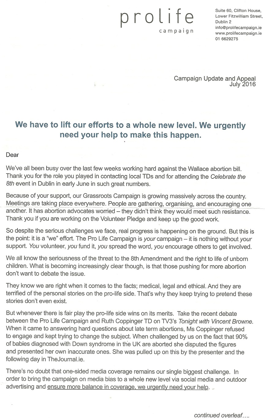 “Campaign Update and Appeal July 2016” Letter and Postcard from the Pro Life Campaign » JUly16plc1