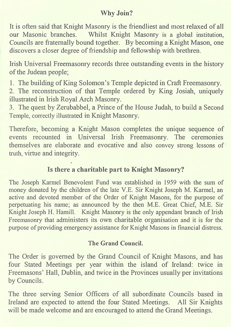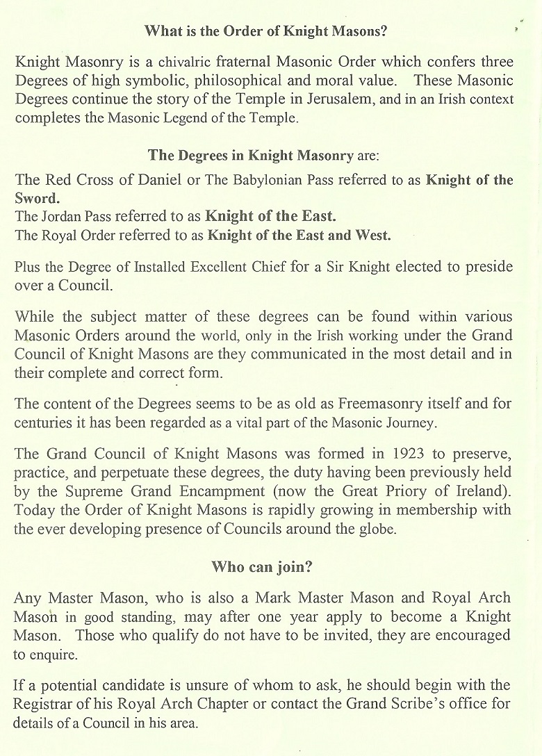A Leaflet from “The Chivalric Order of Knight Masons” detailing who they are, why and how to join and other details.