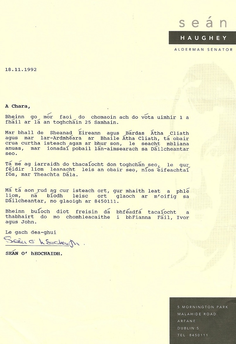 1992 Litir chuig vótálaithe ó Sean Haughey as Gaeilge » shaugheyasgaelige