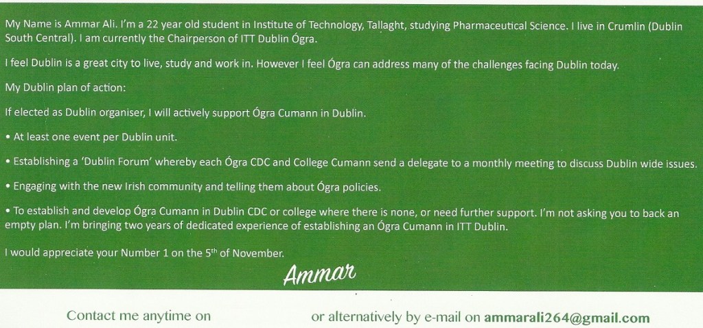 Ammar Ali for Ógra Fianna Fáil Dublin Organiser leaflet » ammaralidubogra2
