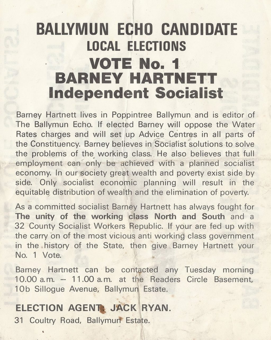 Leaflet from Barney Hartnett -Independent Socialist – Drumcondra -1985 Local Elections » bhartnett2