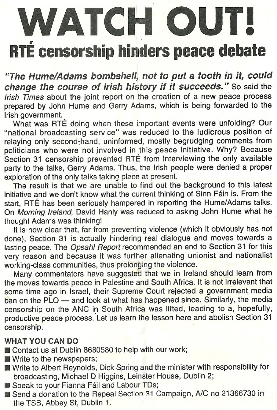 “Watch Out! RTE “News”? Censorship breeds ignorance” leaflet from the Repeal Section 31 Campaign. The leaflet is from 1993 . In January 1994 Section 31 of the broadcasting act was not renewed by the then Minister Michael D. Higgins..