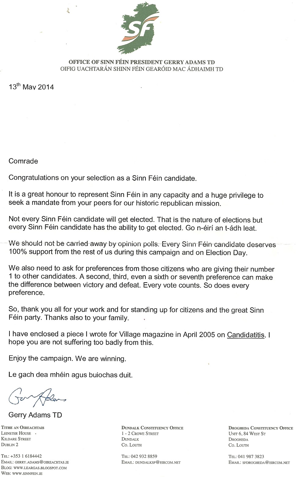 Letter and article from Gerry Adams to Sinn Fein 2014 Local Elections Candidate » candisatelettersf1