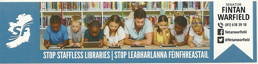 “Stop Staffless Libraries” bookmark from Senator Fintan Warfield of Sinn Fein. » fwarfieldstaffless1