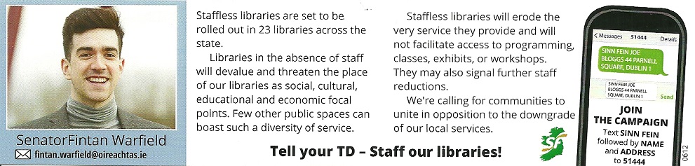 “Stop Staffless Libraries” bookmark from Senator Fintan Warfield of Sinn Fein. » fwarfieldstaffless2