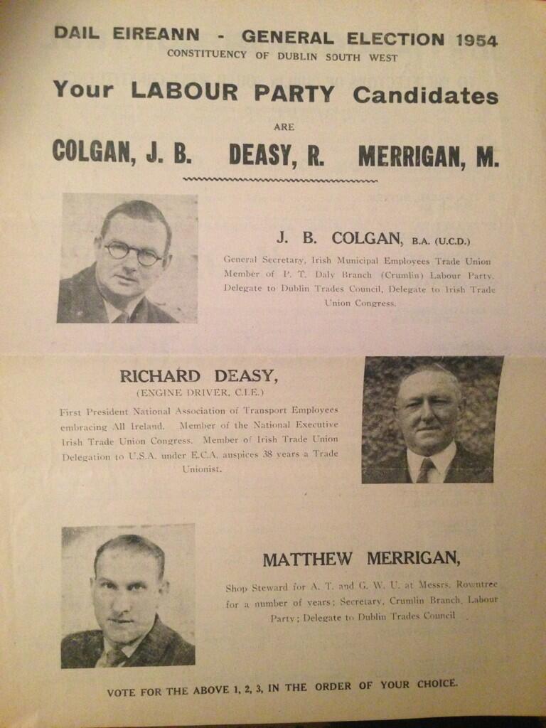 Flyer from JB Colgan, Matt Merrigan, Richard Deasy -Labour 1954 GE Dublin South West » 1954gedsw