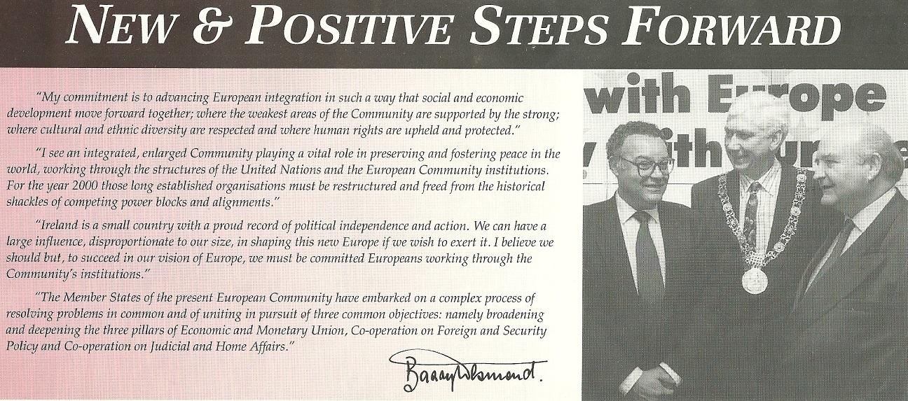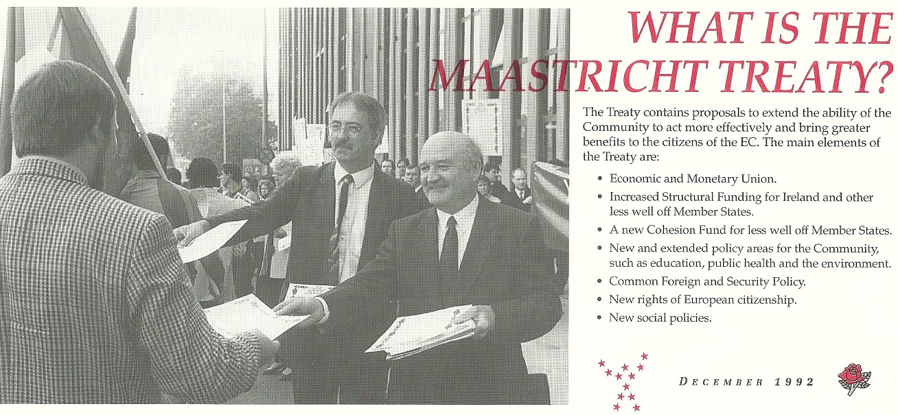 A leaflet produced by The Labour Party and The Socialist Group European Parliament explaining the Maastricht treaty , what it was , it’s benefits and challenges for Ireland. It has pieces by Barry Desmond, Dick Spring and Niamh Bhreathnach.