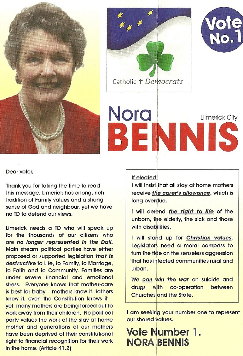 Leaflet from Nora Bennis -Catholic Democrats – Limerick -2016 General Election » NBennis16a