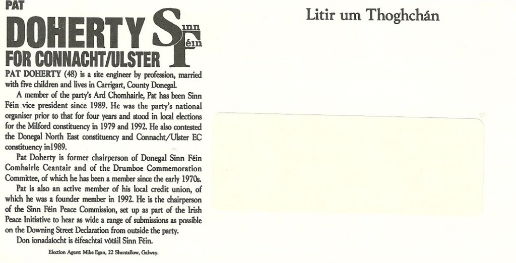 Leaflet from Pat Doherty -Sinn Fein -Connacht-Ulster -1994 European Elections » Pdoherty94b