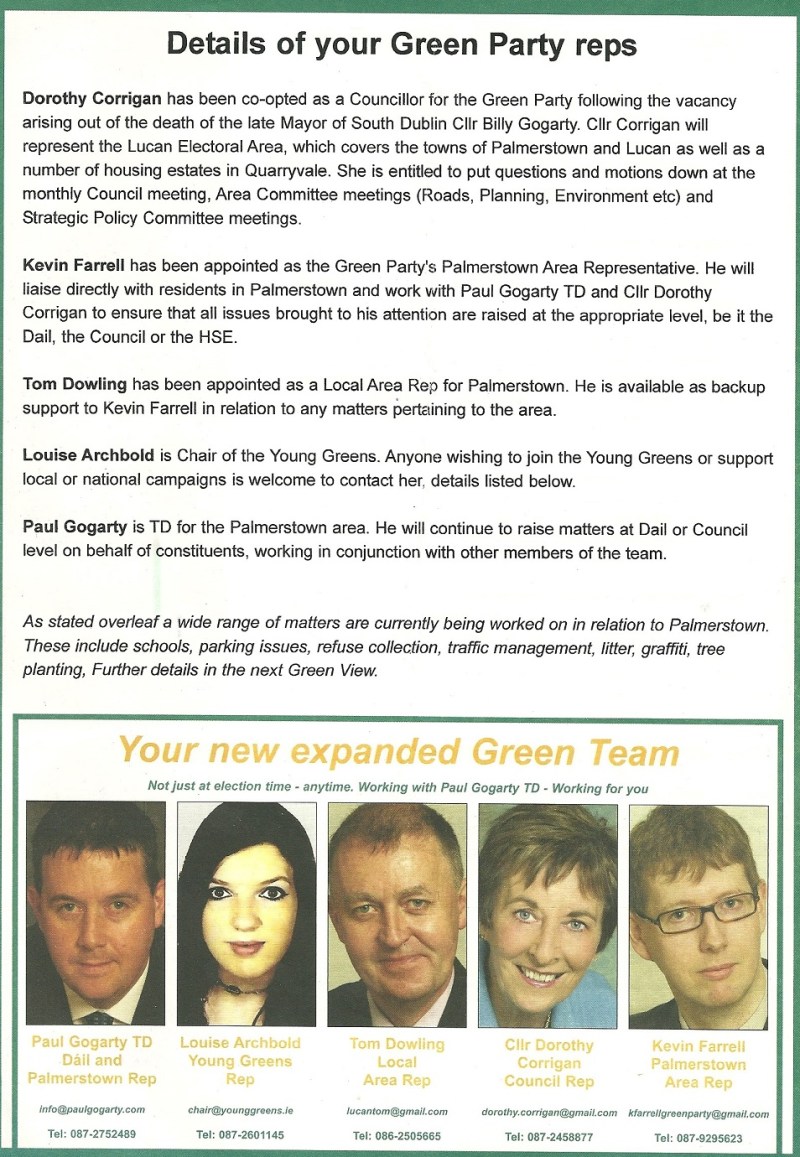 From 2007 following the sad passing of Billy Gogarty and Fintan McCarthy, a leaflet from Paul Gogarty and The Green Party in Palmerstown outlining the changes to the party reps in the area. Paul Gogarty was the TD for the area, Dorothy Corrigan became a Councillor, Louise Archbold was the Young Greens Rep , Kevin Farrell along with Tom Dowling were the new Palmerstown Reps.